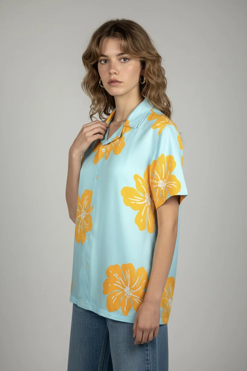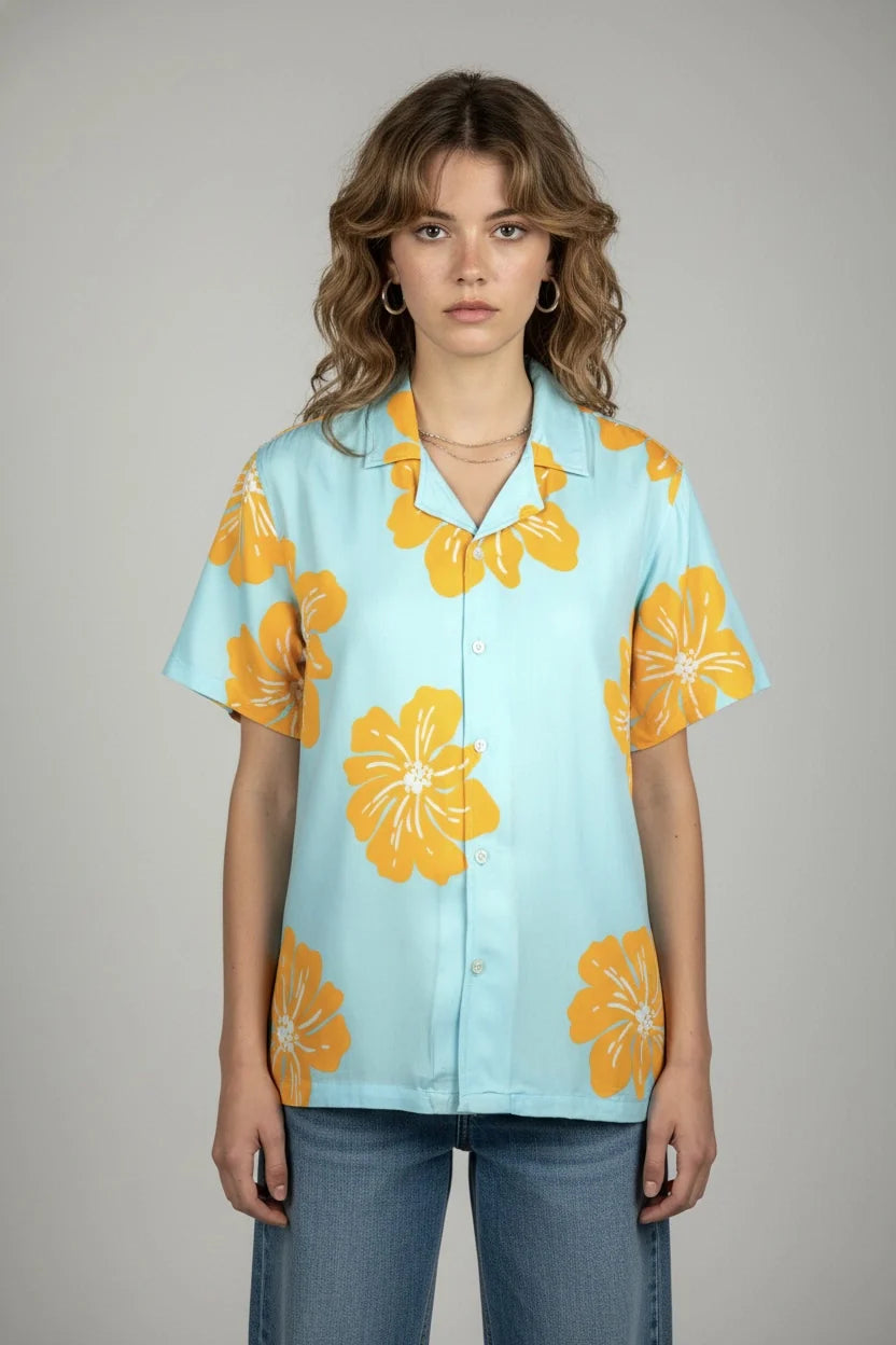 A classic tropical shirt reimagined with punchy yellow florals on a sky-blue base. It?s giving vacation-core energy?bright, carefree, and ready for sunsets, reels, and coastal selfies. For those who dress like every day is a beach day, even when it's not.