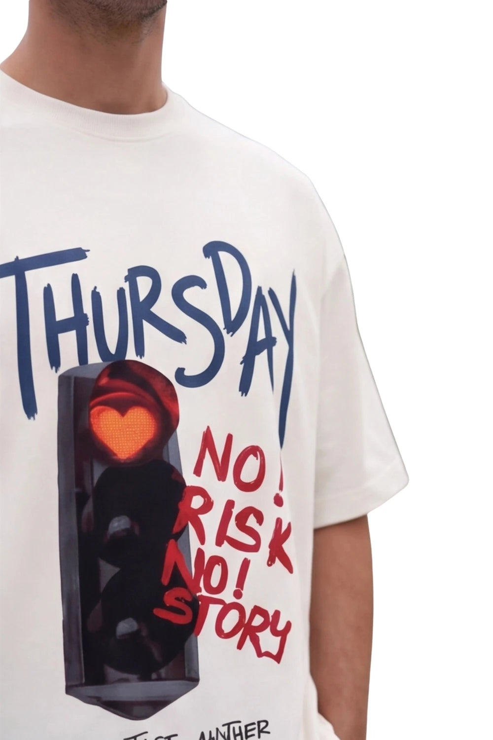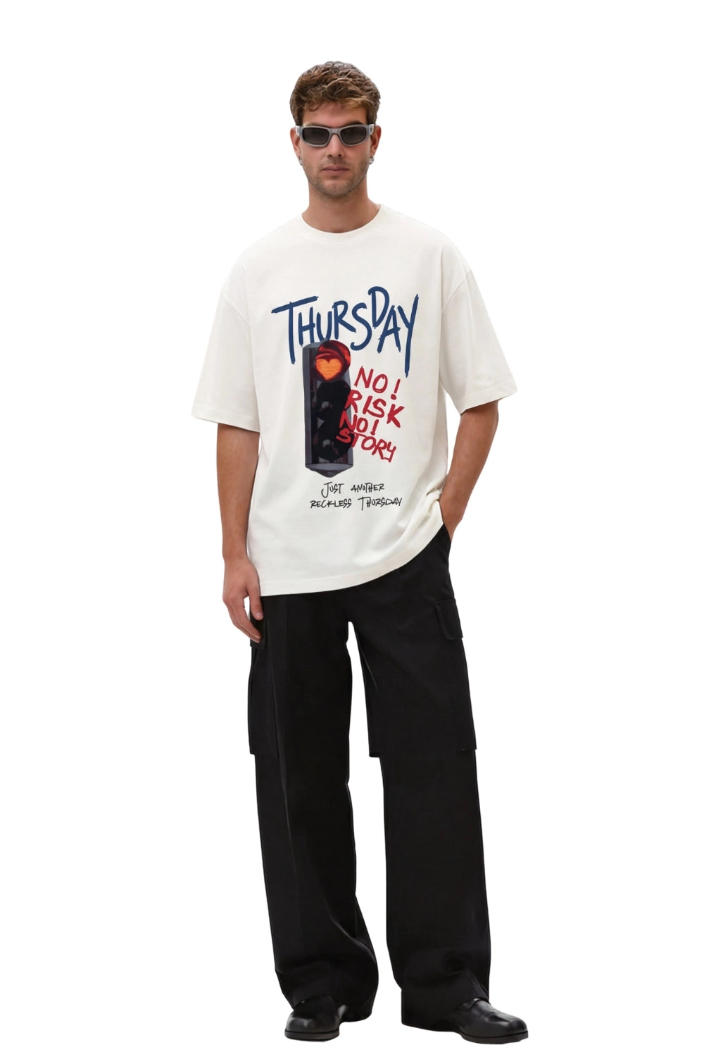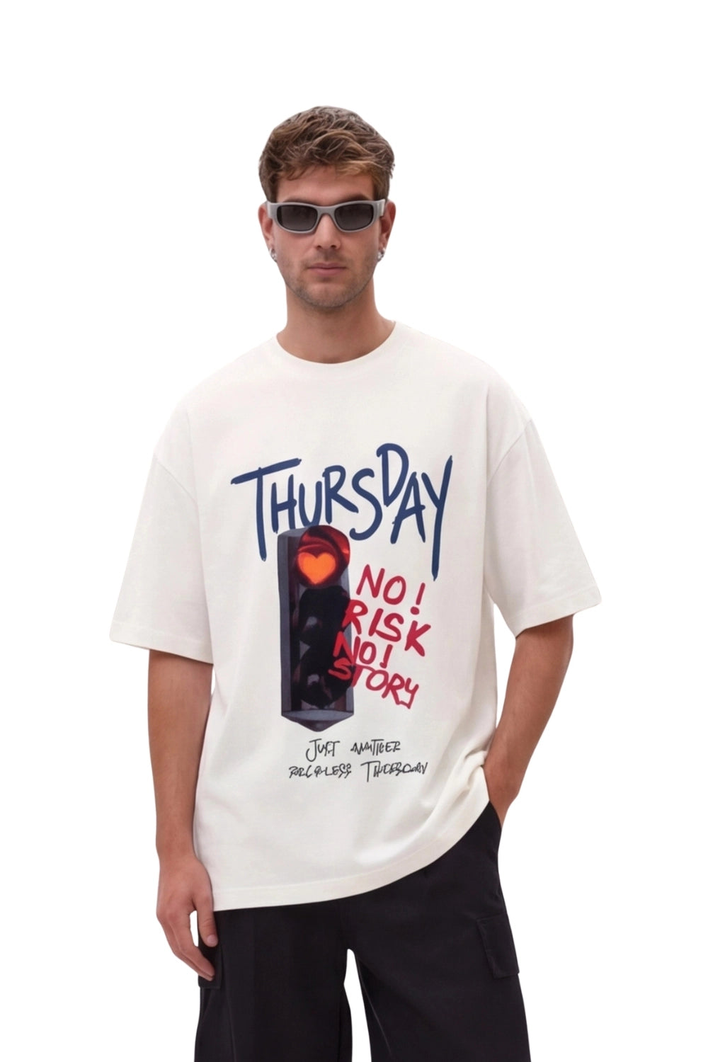 A bold oversized graphic tee featuring a stylized traffic signal with a glowing heart, paired with expressive handwritten typography. Made for the mid-week troublemaker, this design captures the thrill of a reckless Thursday and the stories that come with it.
