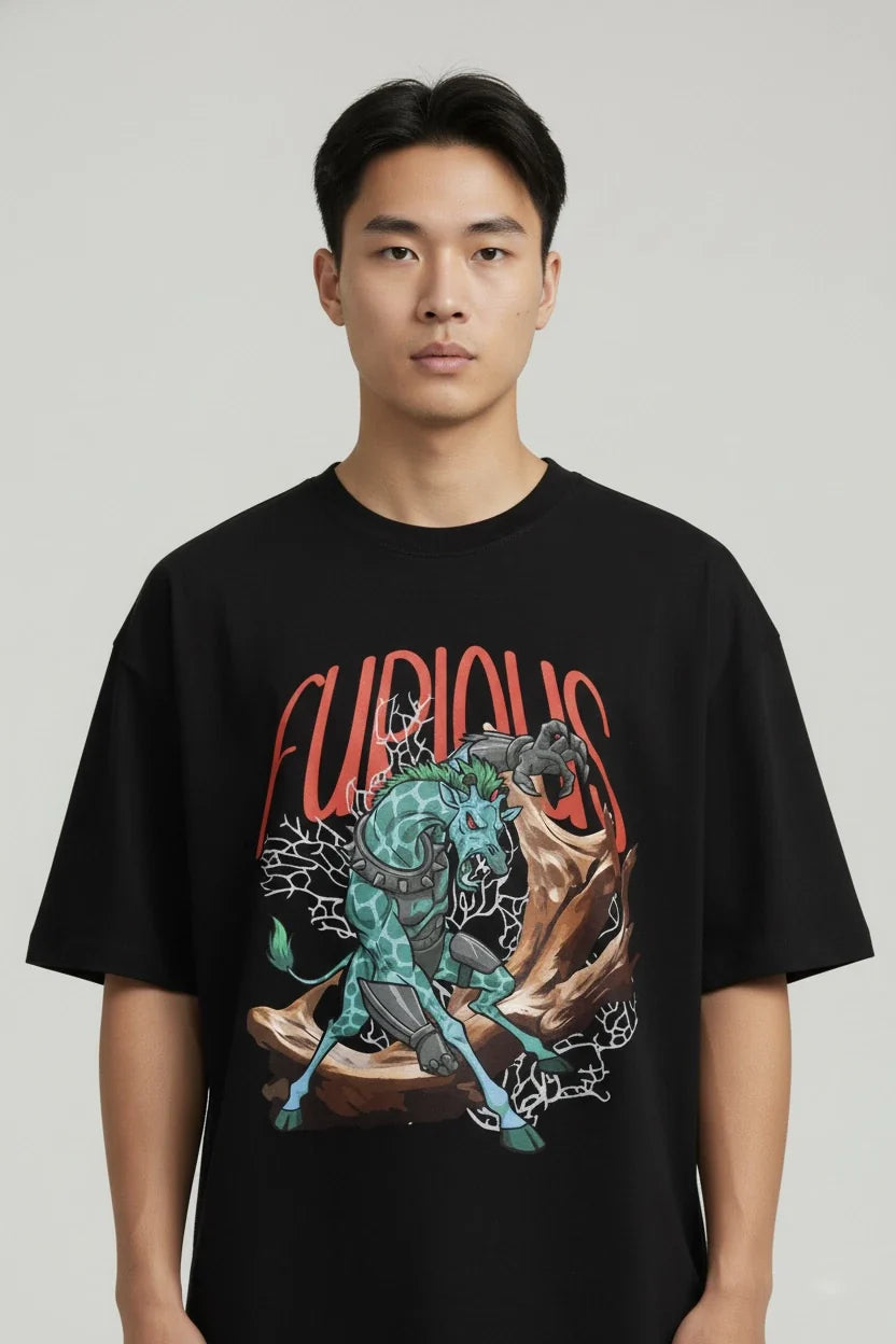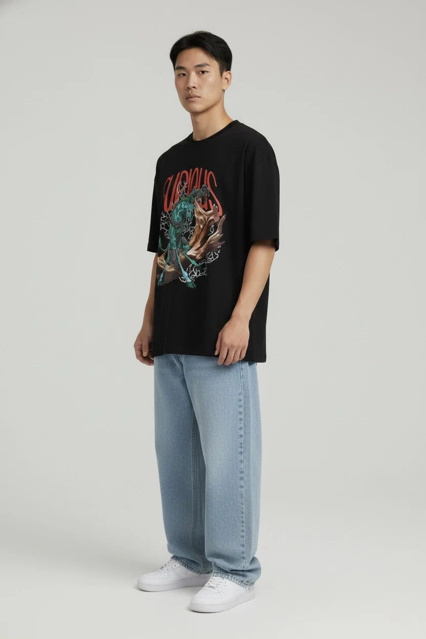 A bold, dynamic oversized graphic tee featuring a furious warrior locked in battle. Intense detailing and strong colours make this piece perfect for statement streetwear with an edge.