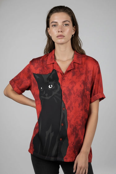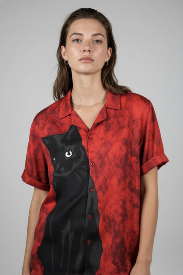 black cat print cuban collared shirt - red shirt - frontview