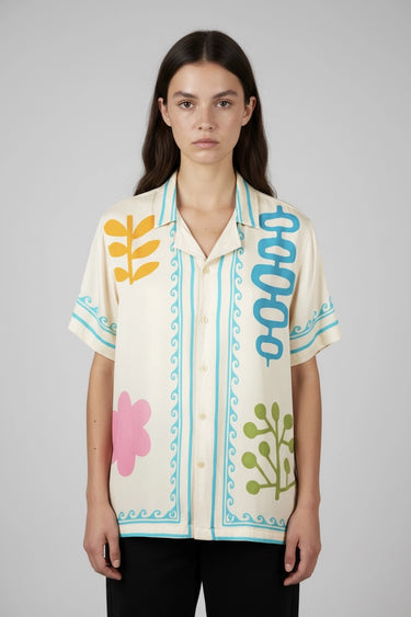 Minimal yet meaningful, this shirt brings together flat folk-inspired icons with a contemporary twist. The clean layout and soft tones speak to a new-age aesthetic—one that respects roots but reimagines them through modern lenses. For the calm, curated dressers.