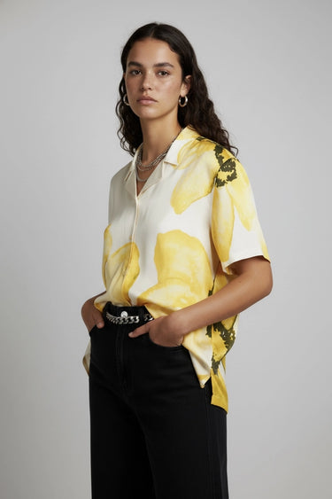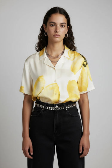 Oversized yellow florals spread across a cream base in a watercolor style, this shirt speaks soft but makes a bold impact. It’s romantic, artsy, and made for the effortlessly aesthetic crowd who want their fits to feel like a sunlit mood board