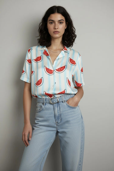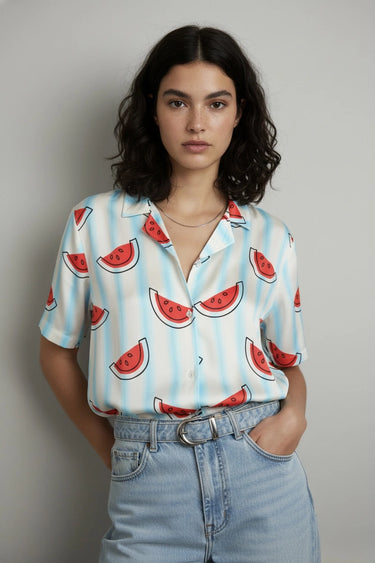 Nothing screams dopamine dressing like floating watermelons on a pastel-striped base. Fun, fruity, and ironically cute—this shirt is perfect for the playful souls who love summer vibes, quirky patterns, and turning heads for all the right (random) reasons.