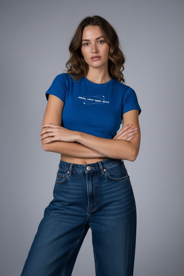 Blue fitted graphic crop top with white "HOT GIRL SHIT" text on front. Blue fitted graphic crop top with white "HOT GIRL SHIT" text on front.